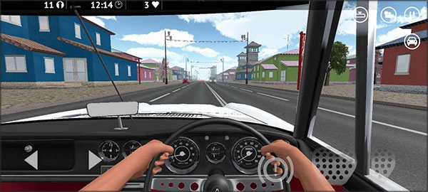 左上角第一个显示的是行驶距离,中间是时间计时,接下来是生命值。车辆一旦发生碰撞就会损失一格生命值,右上方的图标信息依次为后视角、相机(用于视角切换)、暂停和菜单按钮,以及车辆内部的灯光、喇叭和转向灯。
