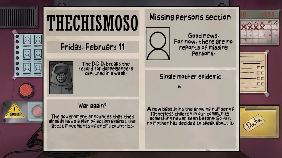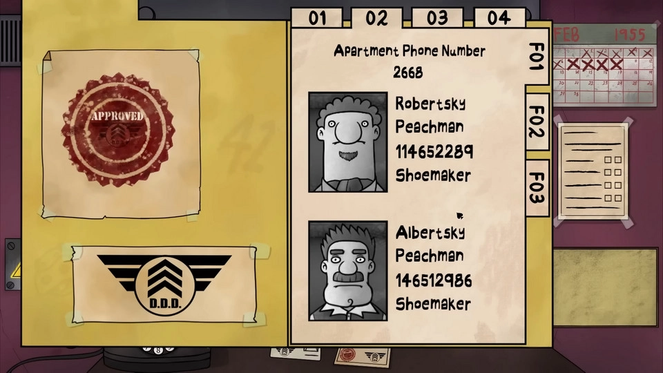1955年,不明原因导致伪人活动变得异常猖獗,这些生物能完美模仿人类的外形,试图悄悄渗透进人类社会。为了应对这一危机,替身侦测局(D.D.D.)迅速启动了专项行动。玩家将以新任门卫的身份加入该局,主要职责是严格审核公寓的进出人员。这份工作表面上看似轻松简单,实则暗藏重重危险——任何一次疏忽都可能让伪人成功入侵,进而威胁到整栋公寓居民的生命安全。因此,玩家必须对每一个细节都保持高度警惕,在一次次谨慎的审核中,逐步探寻伪人频繁活动背后隐藏的真相。