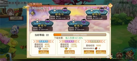 连协修炼玩法中,天道九级的达成条件是连协总和达到100级。这里有个小技巧分享:四个修炼项目之间最好间隔五分钟开启。这样当第一个修炼结束时,另外三个还在进行中,此时第一个位置的修炼仍能保持最高倍率。通过这种卡点安排,可以让每个修炼位置都始终处于最高倍率状态!