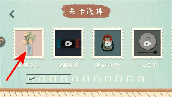 在关卡选择页面,点击红色箭头所指的解压泡泡关卡,就能进入对应的消消乐游戏场景,开启该关卡的挑战。
