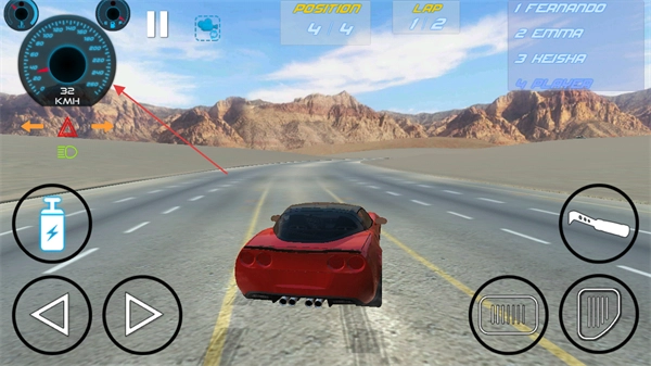 借助左侧的左右方向键来灵活切换车道,避开各种障碍,始终保持高速行驶的状态,以此来提高比赛的排名。