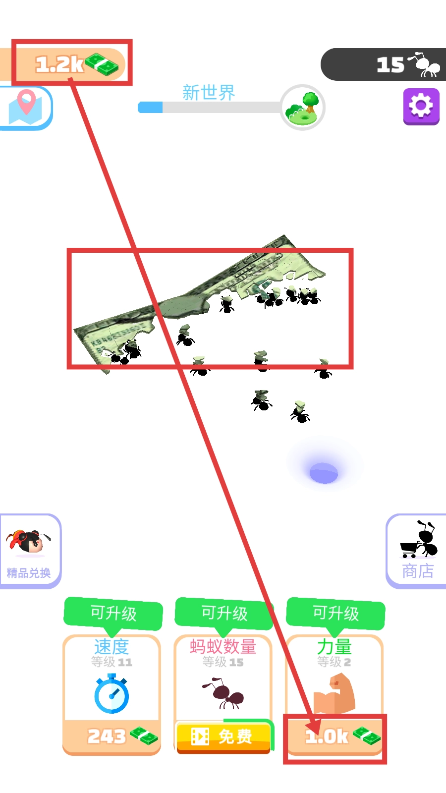 当资金积累到1.2k时,优先升级【力量-1.0k】,这样能让蚂蚁更高效地搬运大额资源,从而快速积累更多资金。