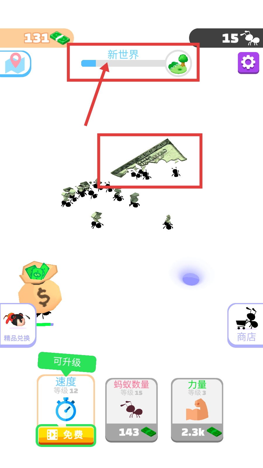 留意【新世界】的进度条,借助蚂蚁不断搬运资源,推动进度来解锁新的区域与内容。