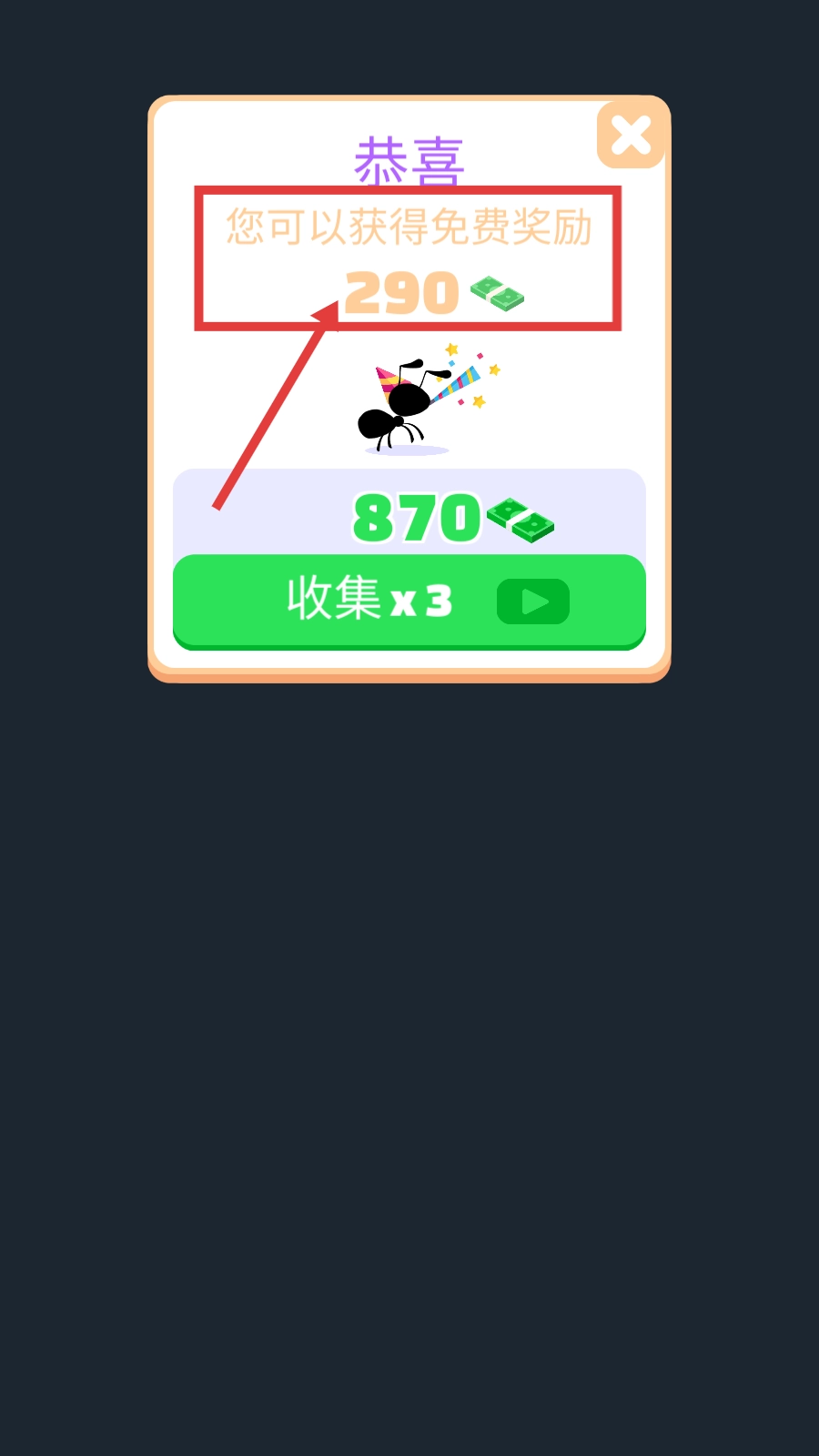领取【免费奖励-290】资金,点击【收集x3】观看广告,就能获得三倍资金,可用于各项升级。