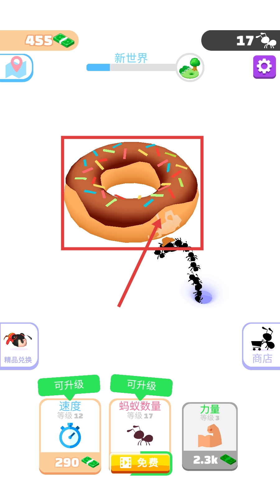 当蚂蚁搬运甜甜圈时,通过升级【速度】属性与增加【蚂蚁数量】,可以提高新食物资源的搬运效率,从而快速积累资金。