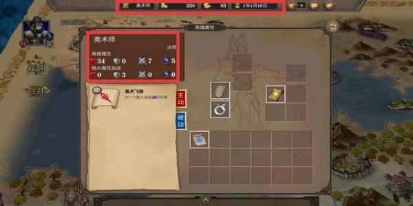 可以留意一下顶部的资源栏,像金币、木材这类资源都在那里显示;然后查看英雄的各项属性,比如【奥术师】当前等级34、攻击力数值为7;之后要结合这些情况,把资源用在刀刃上,好好培养英雄。