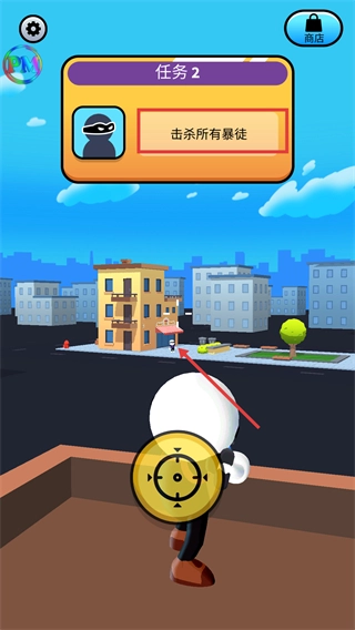 明确【任务2-击杀所有暴徒】的目标,在屋顶场景中锁定地面暴徒的位置,为精准狙击做好准备。