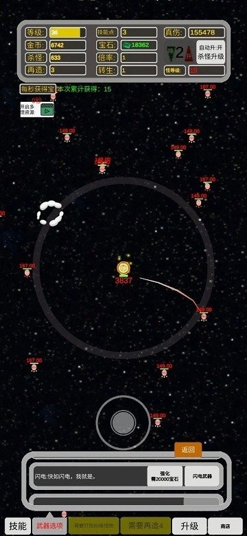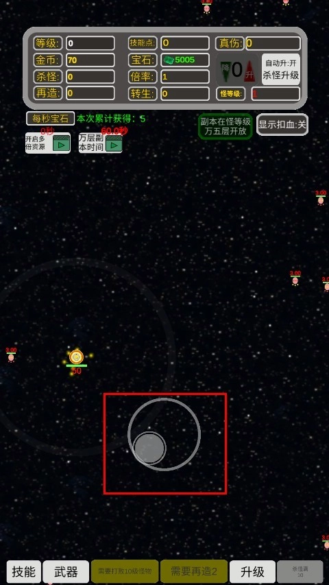 把目标对准红框里的敌人,按下攻击键进行射击,通过累积消灭怪物的数量,来赢得金币和宝石作为奖励。