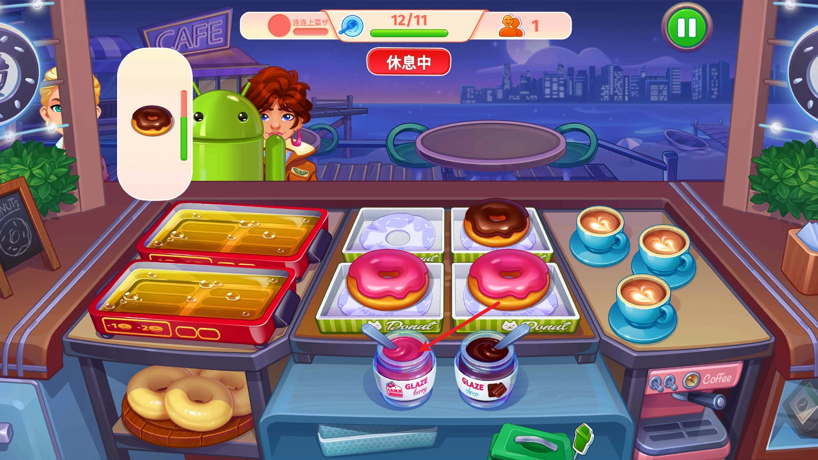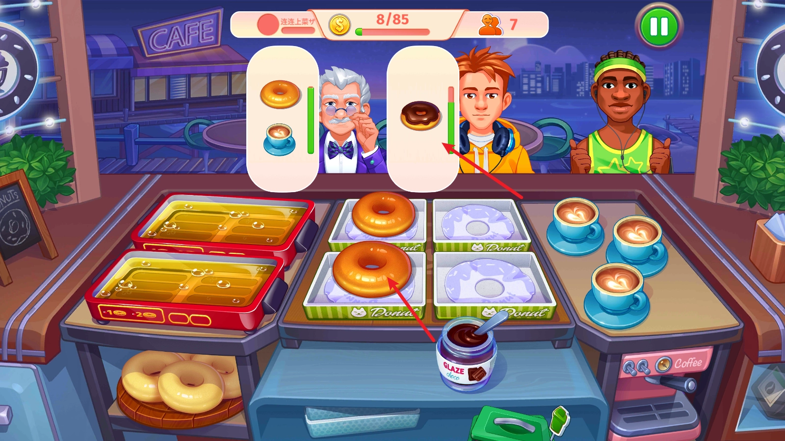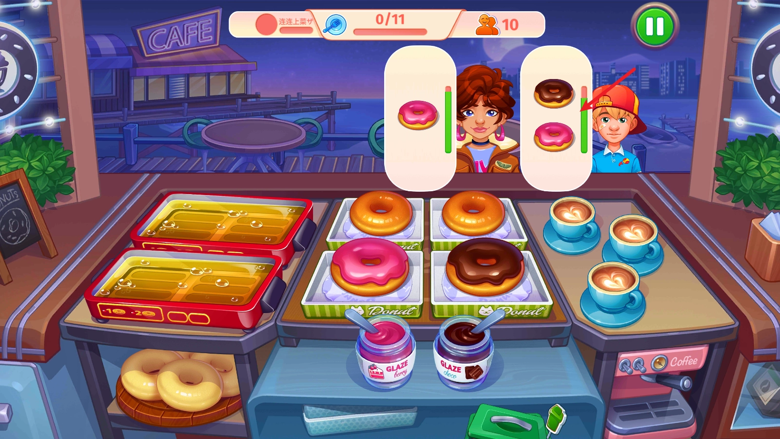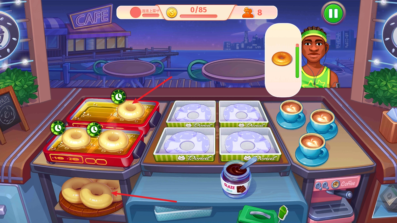 游戏里我们将从制作甜甜圈的任务入手,第一步是点击甜甜圈,通过这种方式就能把它炸熟。
