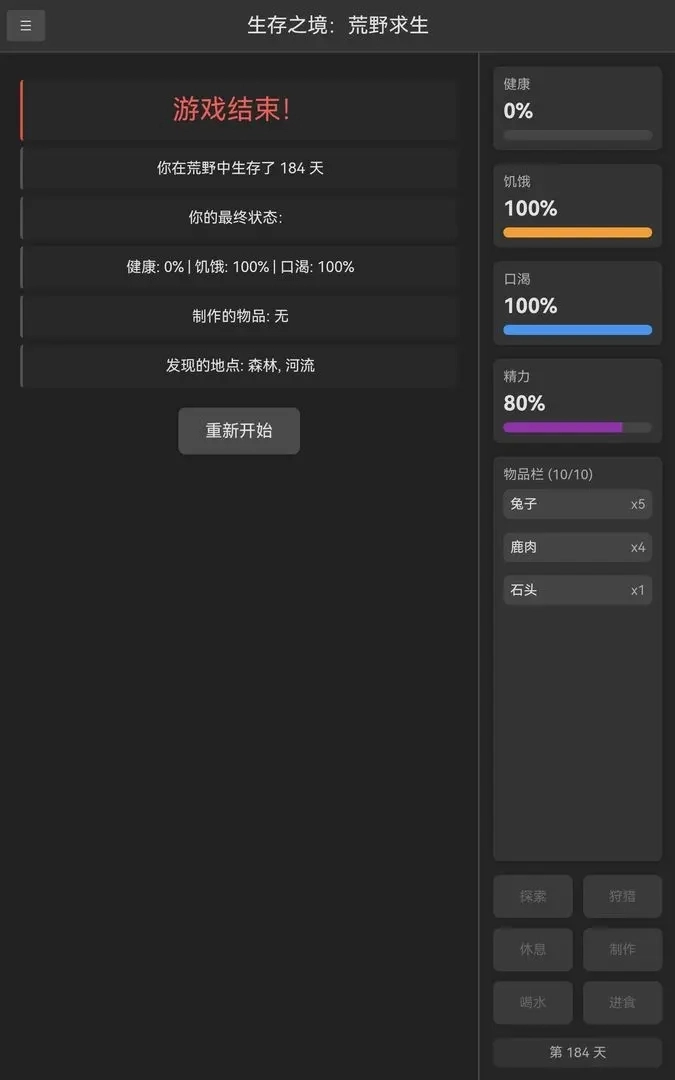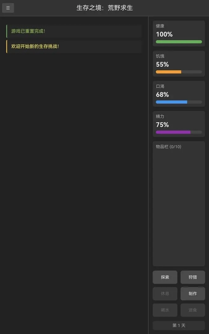 《生存之境:荒野求生》是一款文字生存游戏。进入游戏后,一场意外的空难将你困在蛮荒之地。在这片危机四伏的原始荒野里,你需要对抗饥饿与严寒,寻找生存资源,制作求生工具,凭借智慧和毅力在残酷的自然环境中开辟出自己的生存之路!