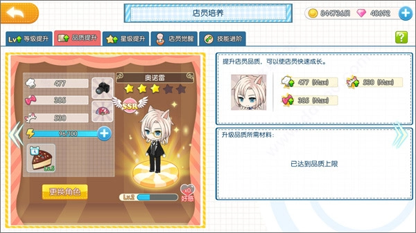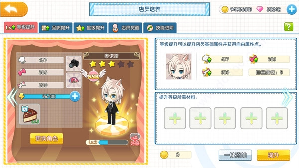 等级提升:想要提升店员等级,既可以使用经验书,也能通过“吃掉”其他店员来实现(这喵星人世界也太残酷了吧)……升级时可以手动挑选升级材料,也能交给系统一键添加。这里得说明一下,系统一键添加的材料仅限珍贵度低于R的路人店员,也就是N级店员,所以店长们完全不用担心自己心仪的小哥哥会被误当成升级材料“吃掉”哦。(啥?你说就喜欢N级店员?那……emmm……)