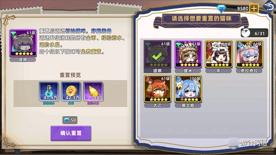 40级以下的猫猫重生时可免费返还全部资源,40级以上的猫猫则能花费50钻石进行重生,从而做到无资源损耗地更换武将!