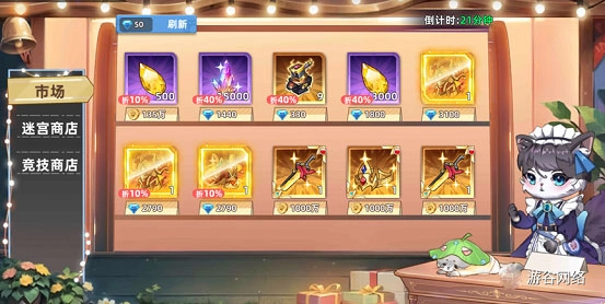 玩家可消耗游戏内的金币、钻石、迷宫币与竞技场币,在市场中购买所需的资源、装备等物品。
