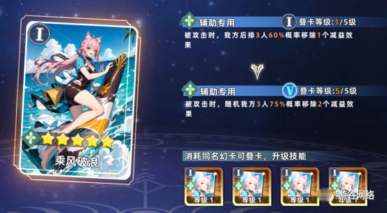 乘风破浪:当受到攻击时,我方随机3人将以75%的概率移除2个减益效果。桃乐自身同样具备移除减益的能力。