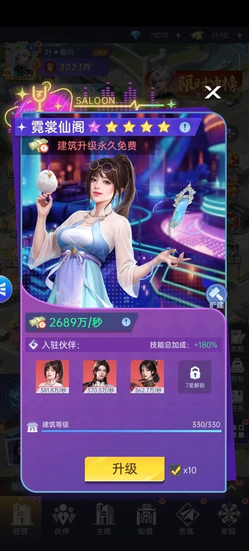 讲完常规建筑的升级事项后,各位仙友接下来要留意一点:游戏第二天凌晨会解锁一个付费建筑,系统不会专门弹出提示,得靠大家手动去查看。这个建筑叫霓裳仙阁,售价128元,经济条件允许的仙友强烈建议购买,它能让前期的收益速度提升将近一倍。(额外提醒:霓裳仙阁只有员工数量的升级是免费的,不需要消耗美金;但建筑本身的升级依旧要用到材料。)