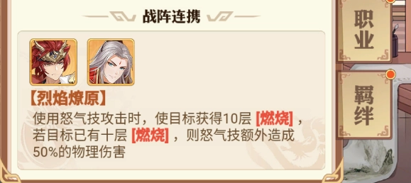 我们再来分析太史慈的战阵连携效果:当他和周瑜同时上阵时,释放怒气技攻击目标会使其叠加10层燃烧状态——这个层数意味着目标行动结束时,将直接损失相当于自身30%攻击力的生命值;若目标已带有10层燃烧,太史慈的怒气技还会额外造成50点物理伤害。由此便能理解太史慈为何是燃烧队的核心,以及燃烧队热度居高不下的原因。