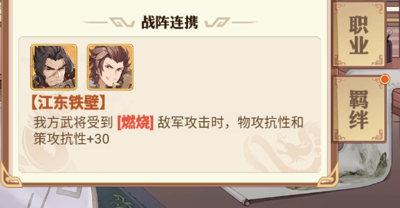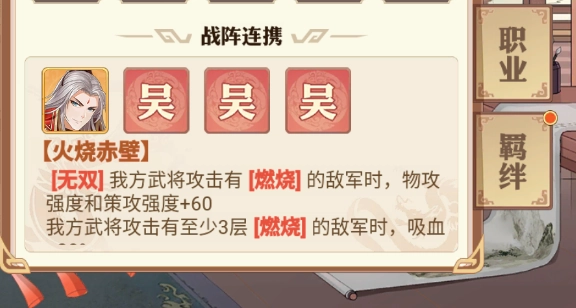 周泰的战阵连携效果需与孙策同时上阵才能触发,当我方受到身上带有燃烧状态的敌军攻击时,能够提升自身的物理攻击抗性和策略攻击抗性。