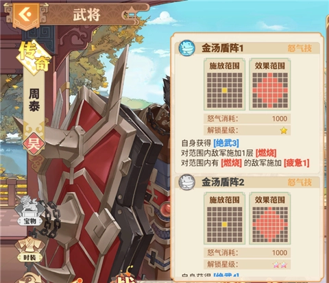 看到周泰手持盾牌,想必大家都能看出他是肉盾型角色。周泰的主要作用是顶在队伍前排承受伤害,这么说是因为:首先,他释放怒气技时能提升自身的物理攻击抗性;其次,受到攻击时会给攻击者附加燃烧效果;另外,怒气技的覆盖范围很广,对范围内的敌军不仅能施加燃烧,还会让已处于燃烧状态的敌军物理攻击强度降低。