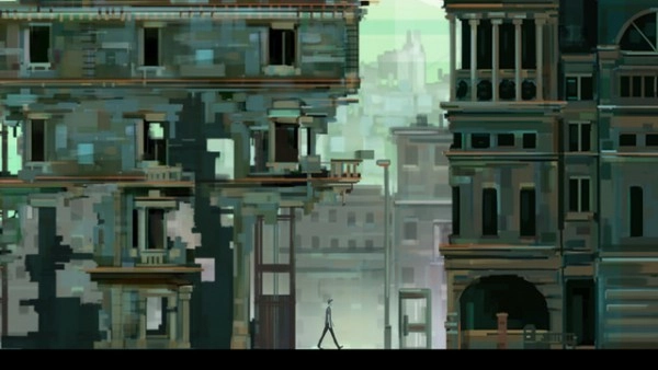 第二天,男主从床上坐起身,房间的墙壁已出现裂痕,右侧的床头灯也摔落在地,但他并未在意,依旧点击了右上角的时钟。场景随即切换,此刻男女主一同坐在床上,男主专注地摆弄着笔记本电脑,女主则在一旁看着他的电脑屏幕。之后的流程和之前一样:两人穿好衣服,来到客厅,男主像往常那样喝了杯咖啡,静坐片刻,抽了根烟,然后下楼,再次踏上寻找与女主共同美好回忆的旅程。