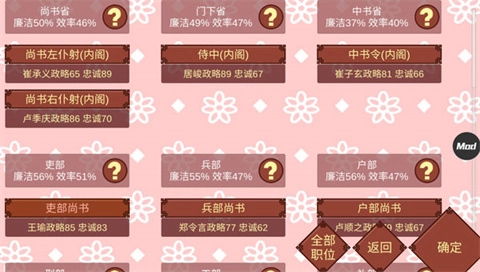 灯会期间会有平民出现,挖宝难度相对较高,不过用来凑人数是可以的,适合放置七八九品的角色;部分官员的夫人虽然没有官职,但属性相当不错,当职位有空缺时也可以多留意一下。
