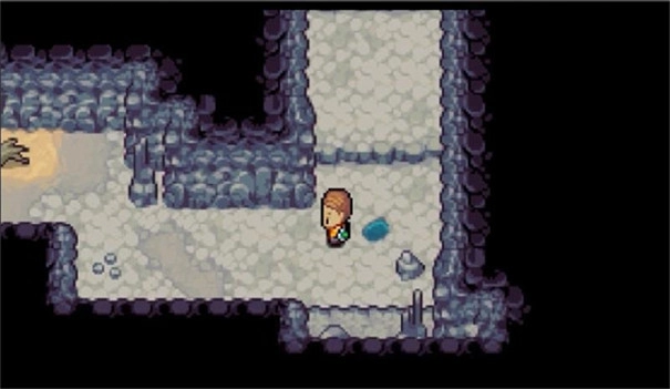 还是第三层,最下面那个冰场一开始是过不去的,得走右边那个梯子,上去之后会看到一个箱子,把技能换成“推”,按照图示把石头推下去,这样才能通过第三层的那个冰场。