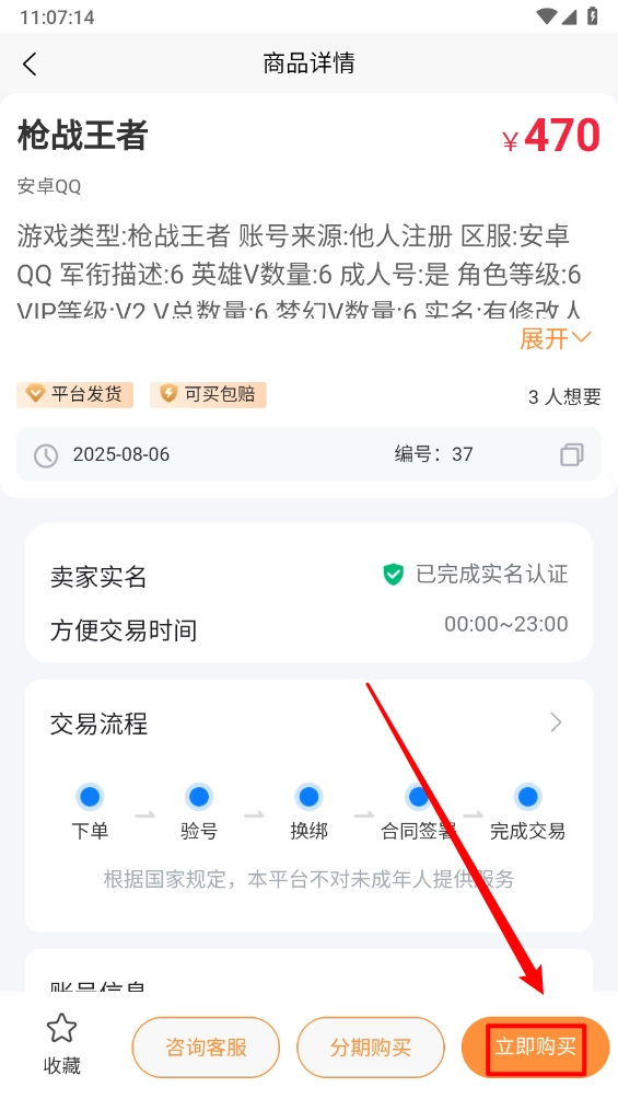 挑选对应的游戏账号进入详情页面查看交易详情,最后点击“立即购买”按钮就可以了。