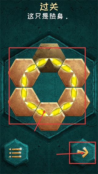 当屏幕上显示“过关”提示时,请先确认被红色框选中的拼图部分是否已完全拼接到位,随后点击对应的前进按钮,即可进入下一个拼图关卡继续挑战。