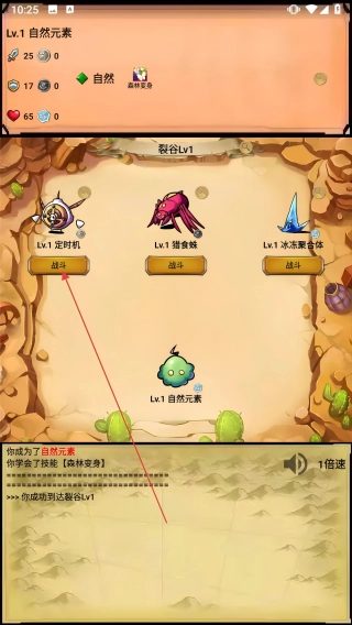 3、在裂谷Lv1,点【Lv.1定时机-战斗】,用技能战斗升级。