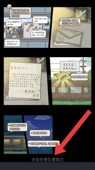 这里呈现的是角色间的书信往来与场景对话内容,其中包含爷爷写给孙子的信件,信里提及“有重要物品藏在纪念碑处”,此外还有部分人物之间的互动交谈。文本底部的“点击任意位置跳过”属于交互提示信息。