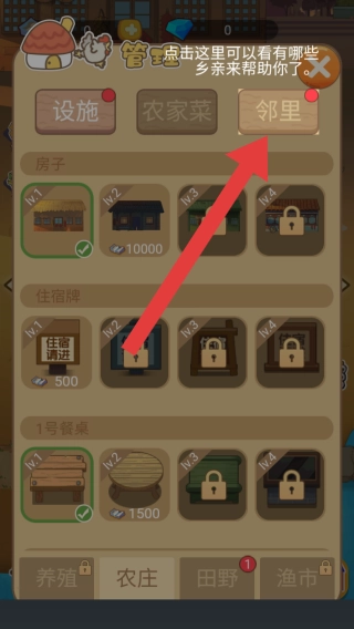 呈现的是“农庄”场景中的“管理”界面,设有“设施”“农家菜”“邻里”选项卡,当前能够对房子、住宿牌、1号餐桌等设施进行升级或查看操作,体现了经营管理的交互环节。