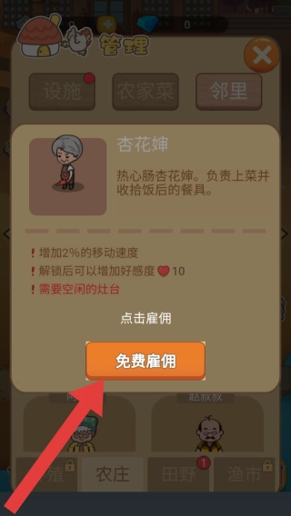 当前显示的是“管理-邻里”界面,其中的人物是“杏花婶”。她是一位热心肠的角色,主要负责上菜以及收拾餐后的餐具。解锁杏花婶后,能够提升2%的移动速度,同时增加10点好感度。目前可以点击“免费雇佣”按钮来雇佣她。