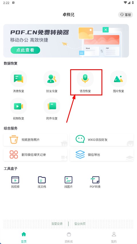 在首页的数据恢复板块中,点击【语音恢复】功能图标,即可进入语音恢复页面。