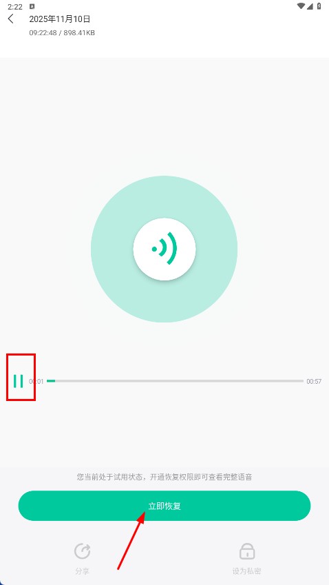 进入语音详情页面后,能够播放语音,并且可以点击【立即恢复】功能按钮来恢复语音。