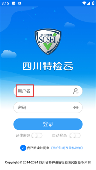 在【四川特检云】的登录界面,找到【用户名】输入框,然后输入相应的用户名信息。