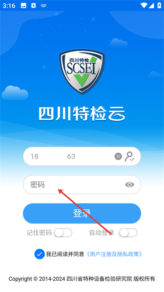 在【四川特检云】的登录界面里,找到【密码】输入框,精准输入该账号所对应的密码。