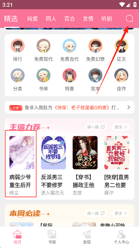 打开书耽后,您可以在搜索栏输入想读的小说名称进行搜索,也能通过下方的分类选项来筛选心仪的作品。