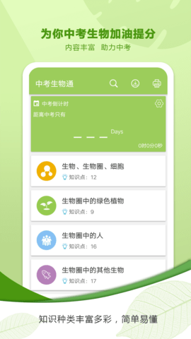 这款应用针对中考生物科目设计了专题练习题目,每道题都配有详细的讲解分析,助力学生掌握解题思路与方法。学生借助专题练习,能够有针对性地攻克薄弱环节,提升解题能力。此外,软件还具备倒计时功能,学生在首页就能看到距离中考的剩余天数,便于合理规划备考时间,时刻保持备考状态。