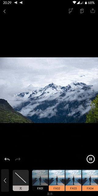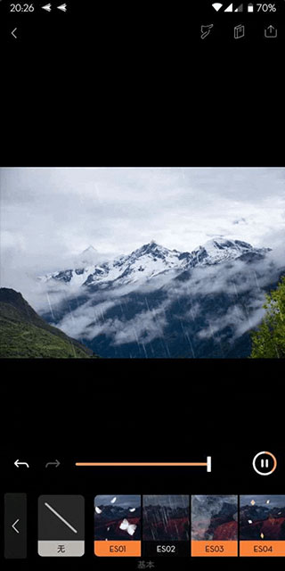若想增强画面的意境,比如营造出“山中细雨,润物无声”的氛围,我们可以在“覆层”选项里选择“细雨”特效,再通过调整强度来把控效果的明显程度,防止因过度突出而干扰主体。