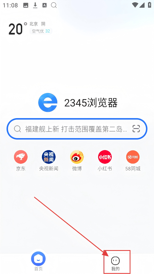在2345浏览器的首页,点击右下角的【我的】按钮,就可以进入个人相关页面,从而开启后续的操作啦。