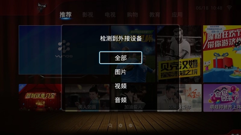 2、天猫魔盒插入U盘,会自动检测到,选择全部。没有自动识别也可以通过应用——本地播放找到U盘;