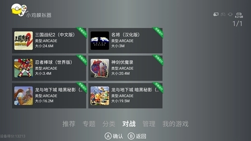 2、打开小鸡模拟器,进入主界面,在画面下方共分有6个项目,分别是【推荐】、【专题】、【分类】、【对战】、【管理】、【我的游戏】,可以通过电视的遥控器与小鸡手柄实现页面之间的切换。