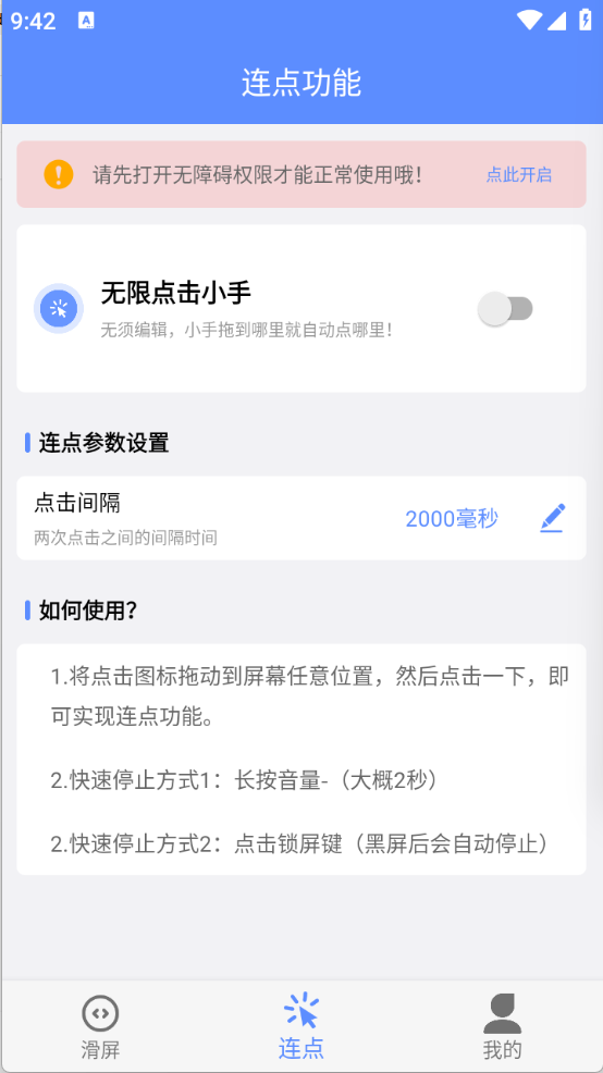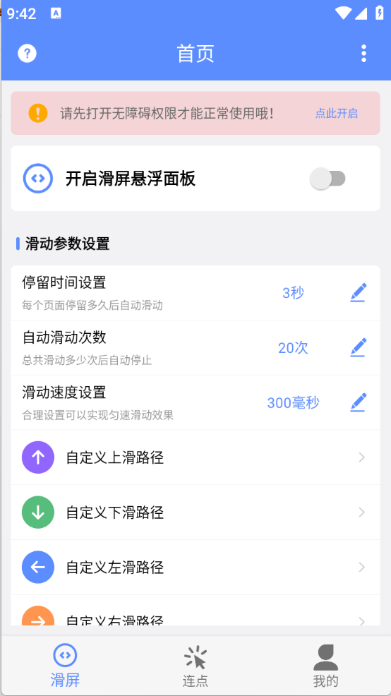 滑屏连点器,能帮你自动完成重复的点击或滑动操作,所有功能完全免费,让你彻底告别手动重复操作的繁琐。无论是刷短视频、看小说翻页,还是其他需要反复进行的动作,它都能轻松胜任。你还可以根据自己的需求,自由设置点击次数、频率以及滑动轨迹,充分满足个性化的使用要求。