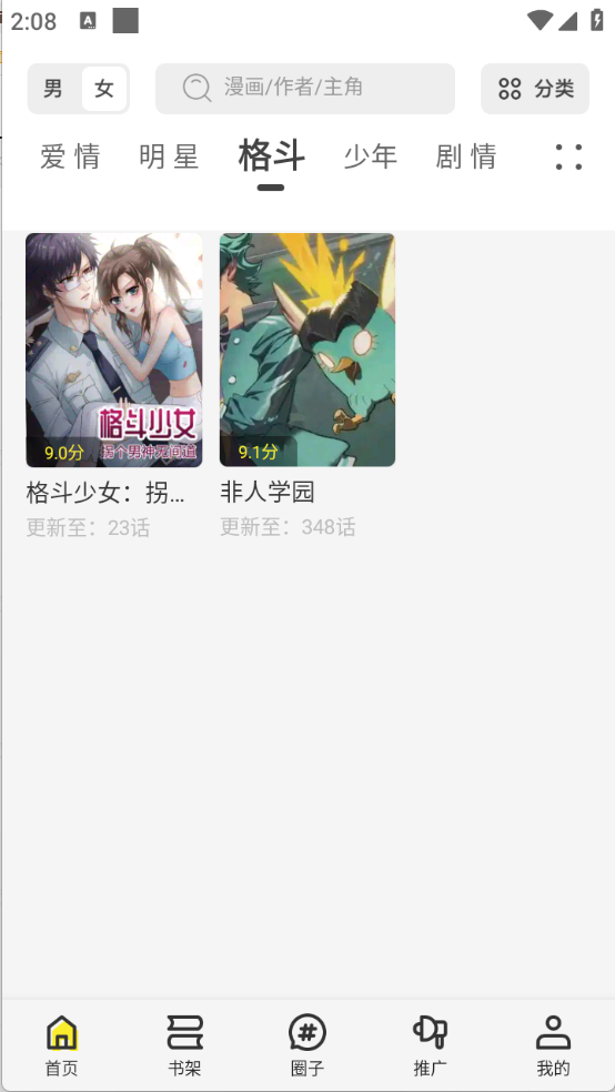 首页顶部栏里汇聚了不少资源类型,像爱情、格斗、少年等类型都包含在内。