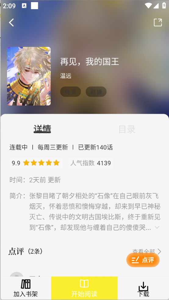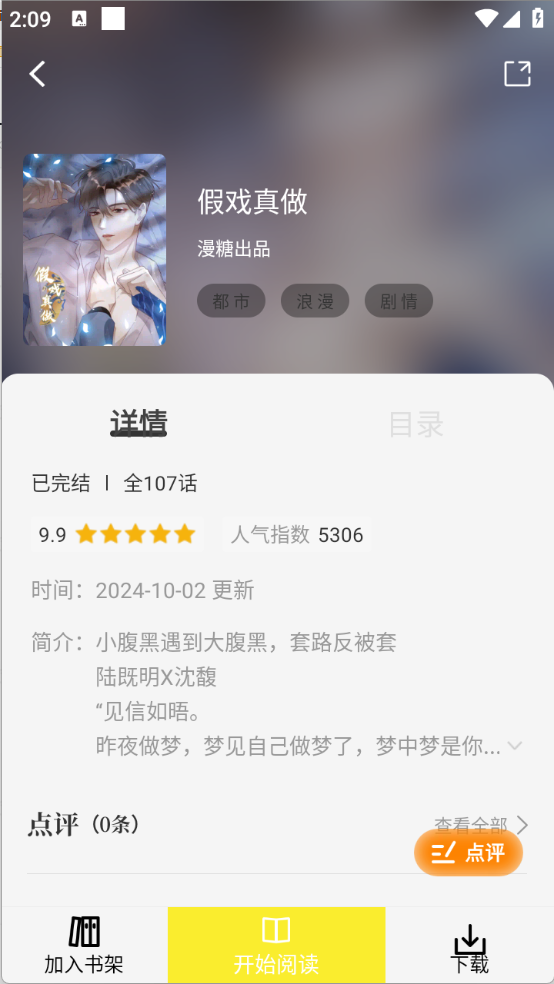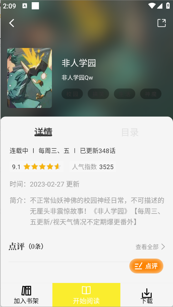 用户点开自己喜欢的漫画资源后,能够进行加入书架、阅读等操作。