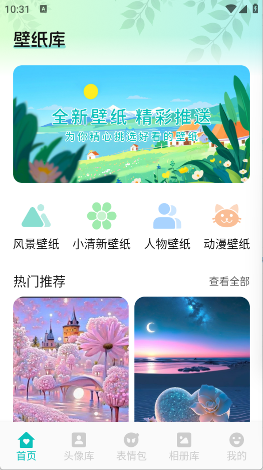 首页页面提供了丰富的壁纸资源,涵盖风景类、动漫类、宠物类等多种类型。