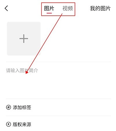 最后把图片或视频的内容描述、标签及来源填写完整,点击右上角的“发布”按钮就可以了。