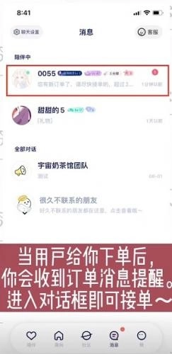 当用户向你下单后,你会收到订单消息提醒,进入对话框就能接单。