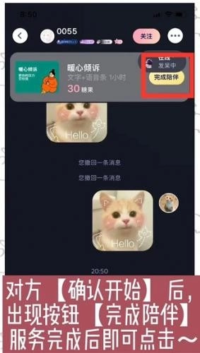 当对方确认开始服务后,界面会出现【完成陪伴】按钮,待服务结束便可点击该按钮。