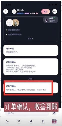 点击【完成陪伴】按钮后,只需等待对方确认订单,就能获取相应收益。
