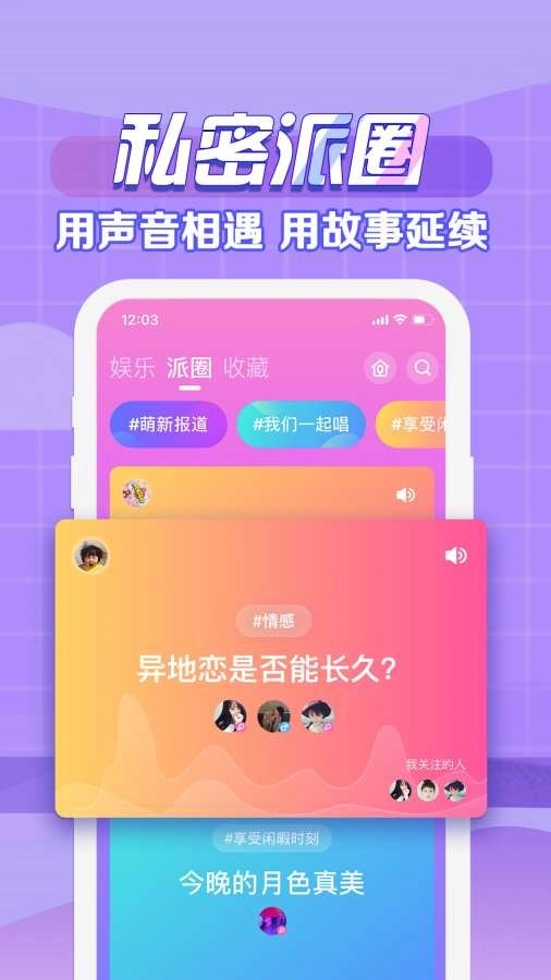 音派是一款面向年轻人的线上声音交友软件,借助声音匹配与互动功能,帮助用户便捷结识志同道合的朋友。平台上聚集了大量声音悦耳、风趣好玩的年轻人,为大家提供了一个富有活力与创意的社交空间。